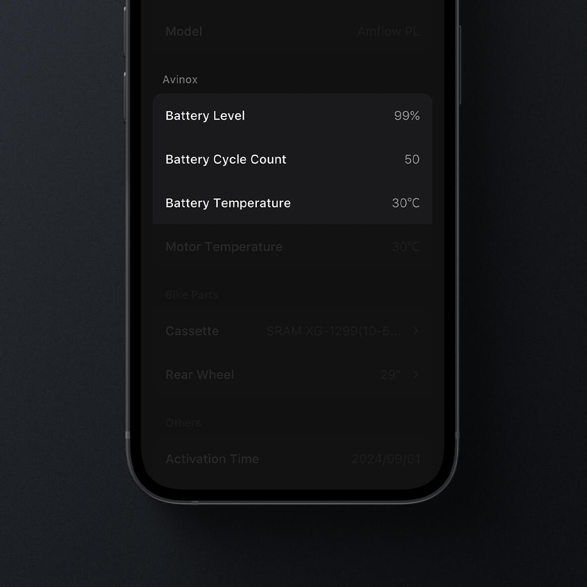 Systém Avinox je plně propojen s aplikací Avinox Ride. Jakmile je aplikace spárována se systémem přes Bluetooth, poskytuje uživatelům inteligentní funkce, jako je ochrana kol, záznam a sdílení dat, nastavení parametrů a kontrola stavu kola v reálném čase.